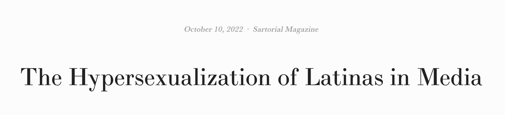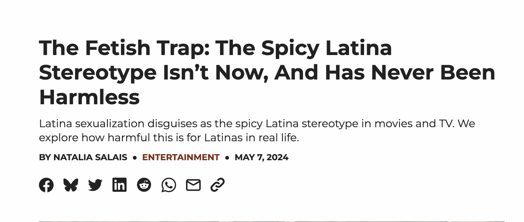"The Spicy Latina" trope originated in the 1930's and 40's.They were often portrayed as "exotic", "fiery" and "seductive". They always spoke in broken English, had dark hair, a curvatius body, fuller lips and an olive skin tone. In the 1950's, Latinos were a heavy subject of parody in the media, which lead them to be seen in a negative light and the women were still seen as sex objects. Towards the end of the 20th centry, a new archatype for Latinas in media was the "tough Latina", where she was still "fiery" and who grew up in "the rough parts of town" and who usually falls in love with a white guy who "saves" her.